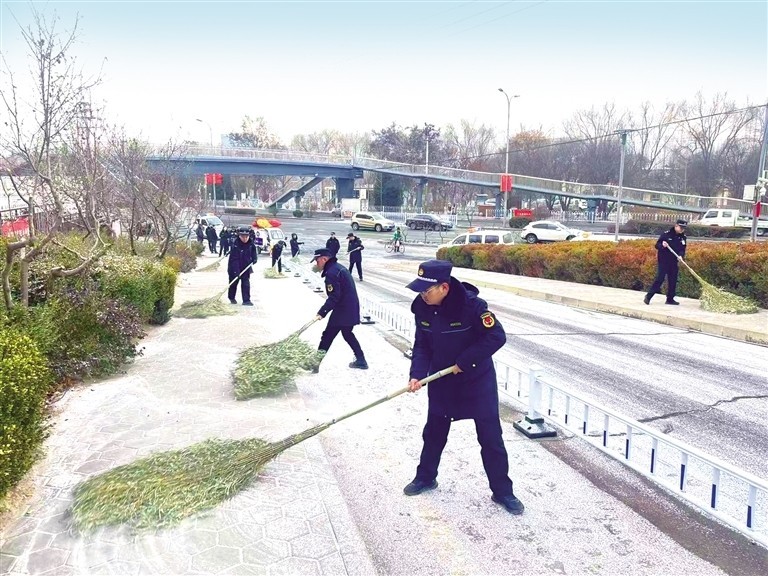 r降雪后,市城管委第一时间启动铲冰除雪应急预案。各县区环卫部门迅速响应,以机械作业为主、人工为辅,按照“先重点后一般、先主干后次巷,梯次清扫、分类作业”的要求,不间断开展融雪剂播撒和清扫作业。在扫雪除冰时,将冰雪暂放在道路两侧不影响通行的位置,及时调度车辆有序清运,确保降雪天气结束后短时间内城区道路恢复安全畅通。